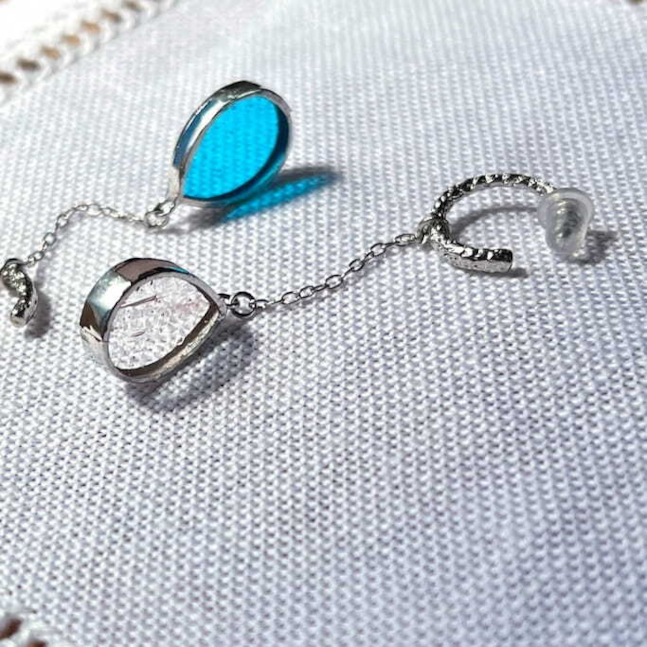 澄んだ空のような青と、無色透明に見える淡いピンク色のガラス。小粒でコロンとしたしずく形です。小さな気泡やスジが入る質感が爽やか。